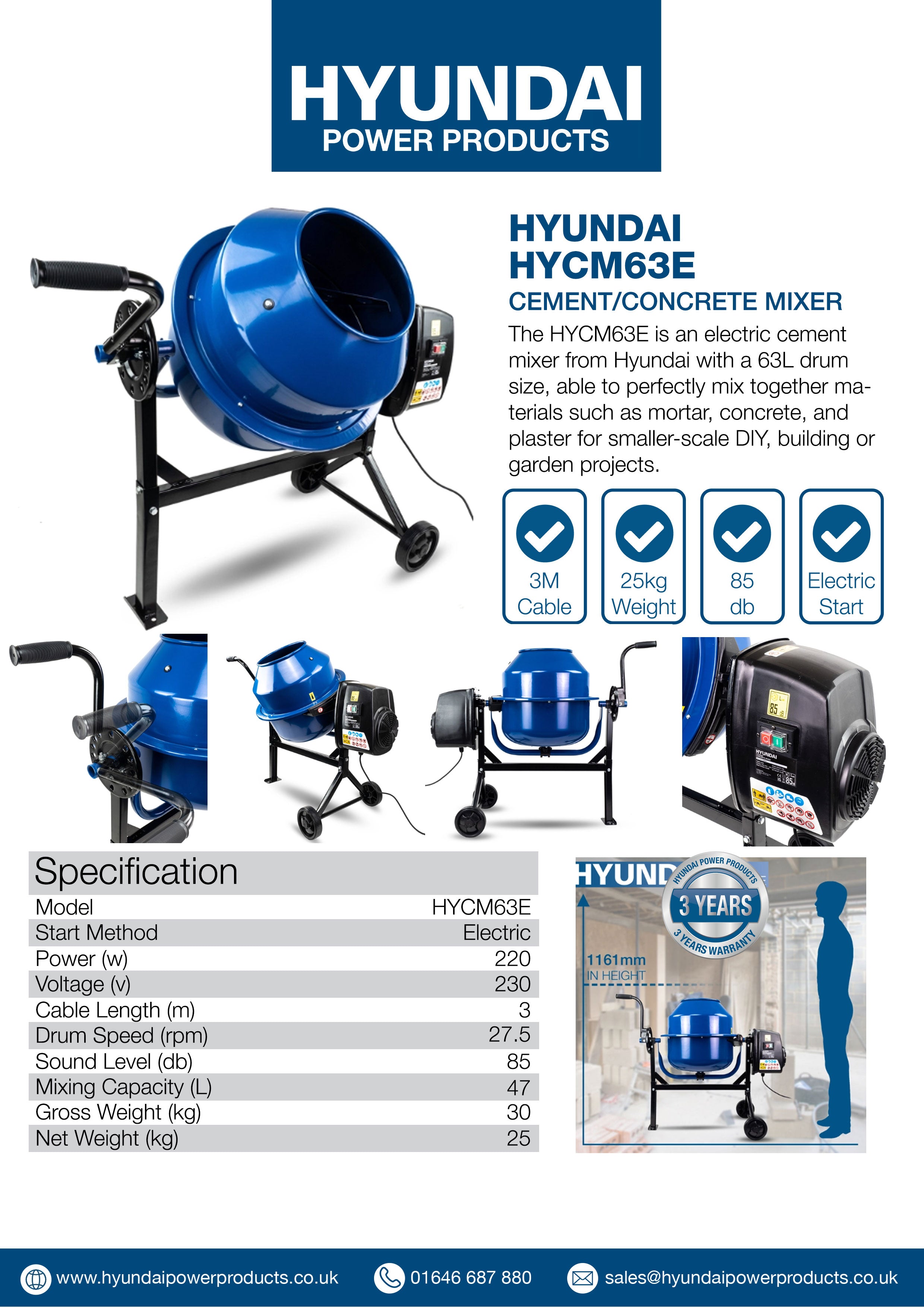 For added peace of mind, this electric cement mixer comes with a 3 year Hyundai home-use warranty* / 1 year commercial warranty* (terms apply), including UK-based parts and service to maintain your machine for years to come.