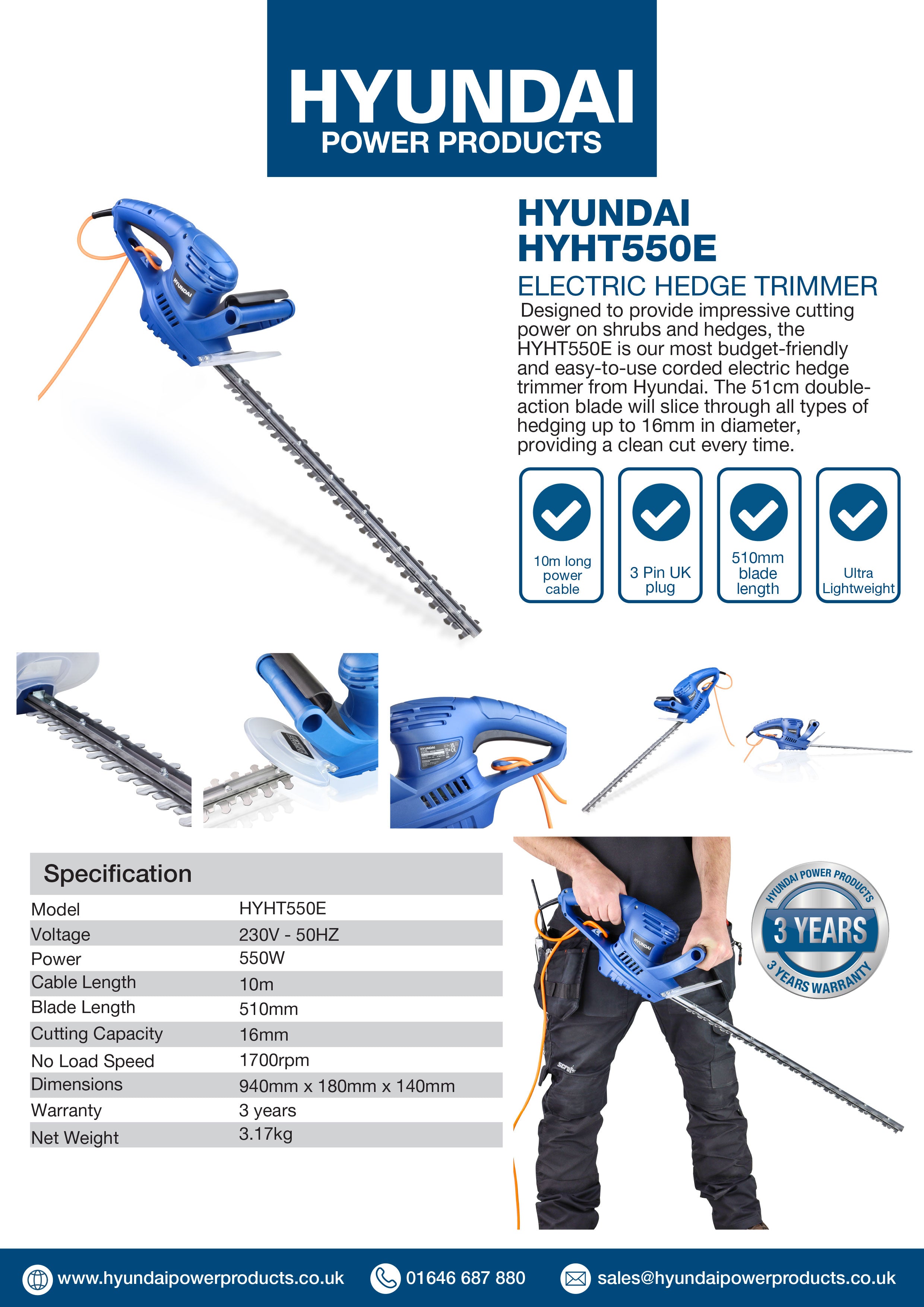 Designed to provide impressive cutting power on shrubs and hedges, the HYHT550E is the most budget-friendly and easy-to-use corded electric hedge trimmer from Hyundai.