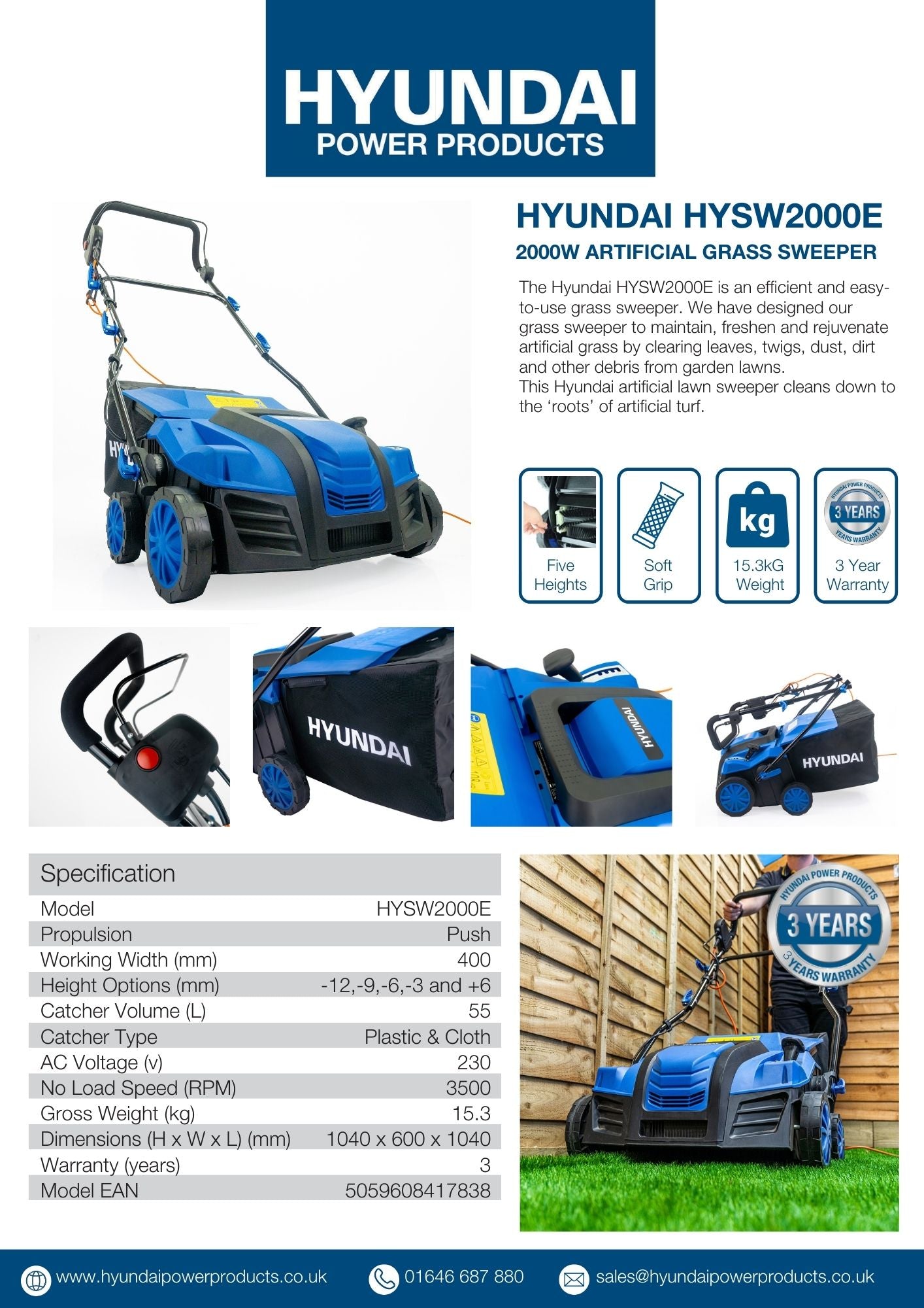 The Hyundai HYSW2000E is an efficient and easy-to-use sweeper. for artifical grass We have designed our grass sweeper to maintain, freshen and rejuvenate artificial grass by clearing leaves, twigs, dust, dirt and other debris from garden lawns.