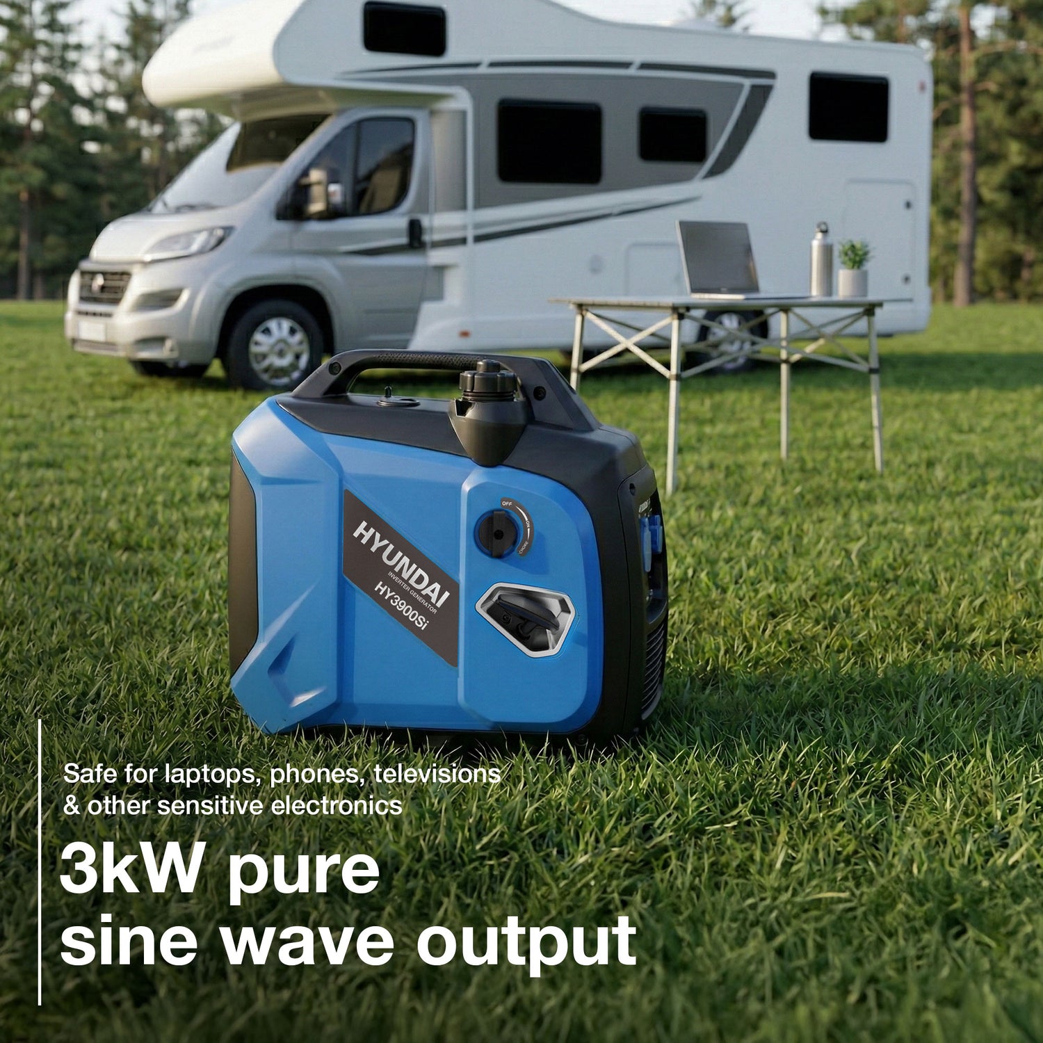 Yes. The pure sine wave output is safe for all caravan electronics, and at 67.6 dBA at half load it is reasonably quiet for site use. The 3.0kW continuous output covers most caravan power needs including fridges, lighting, charging and entertainment systems.