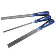 3 Piece Rasp Set. Soft grip handle for user comfort. Double sided with integral storage hanging hole. Contents: flat, half round, and round files.