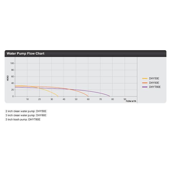 With a maximum suction head / lift of 6 metres and 3" / 80mm inlet and outlet, the DHY80E has a total head / lift of 25m which makes it the ideal water pump for a wide variety of clean water pumping applications.
