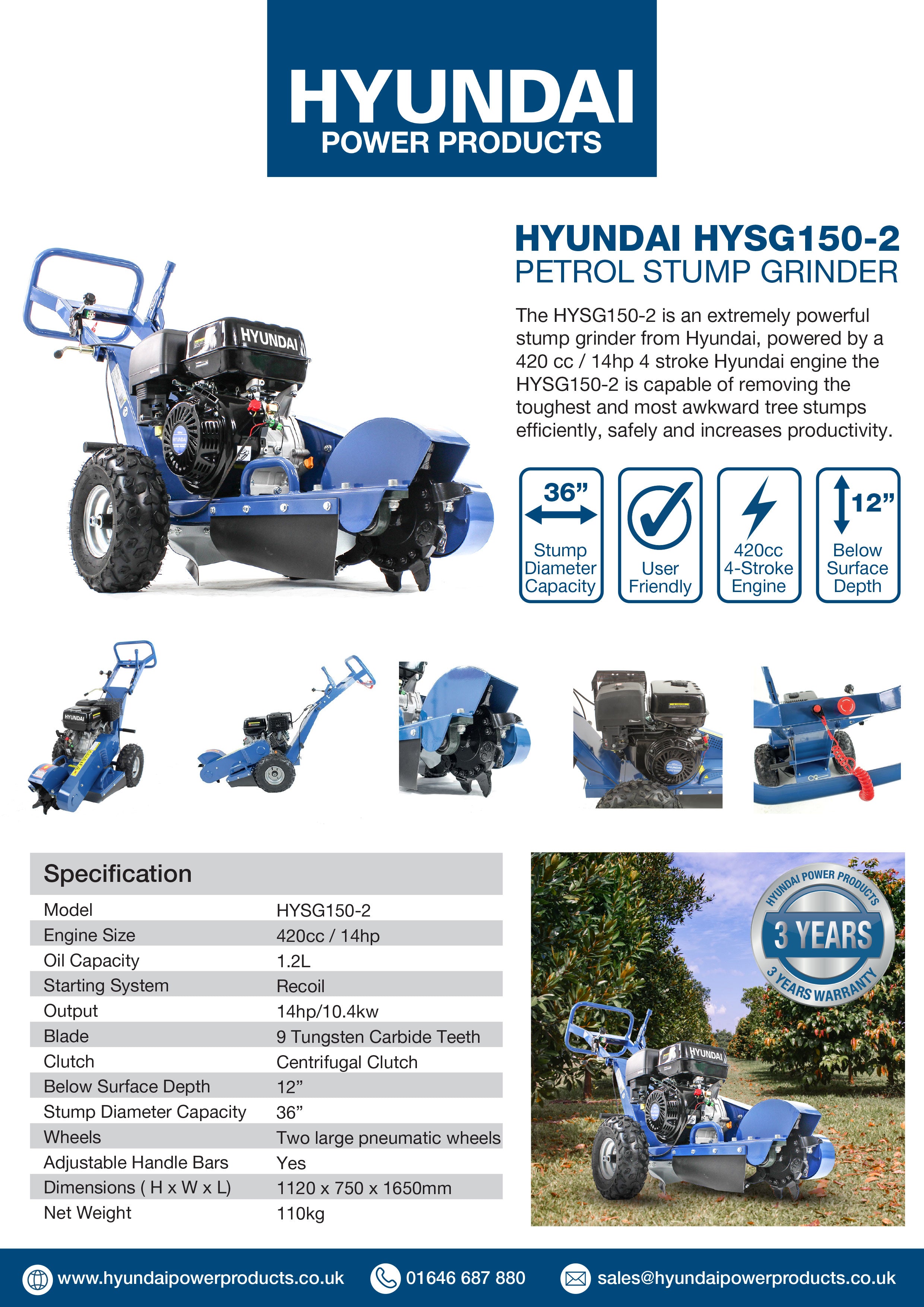 The HYSG150-2 is an extremely powerful stump grinder from Hyundai, powered by a 420 cc / 14hp 4 stroke Hyundai engine the HYSG150-2 is capable of removing the toughest and most awkward tree stumps efficiently, safely and increases productivity.