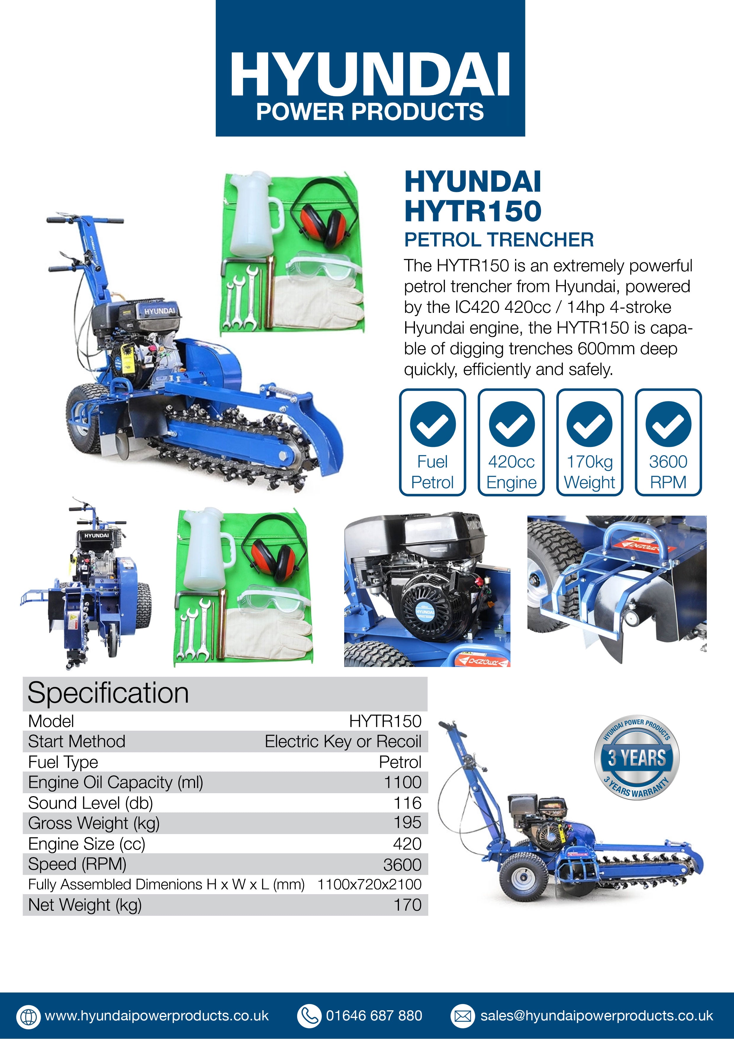 The HYTR150 is an extremely powerful petrol trencher from Hyundai, powered by the IC420 420cc / 14hp 4-stroke Hyundai engine, the HYTR150 is capable of digging trenches 600mm deep quickly, efficiently and safely.