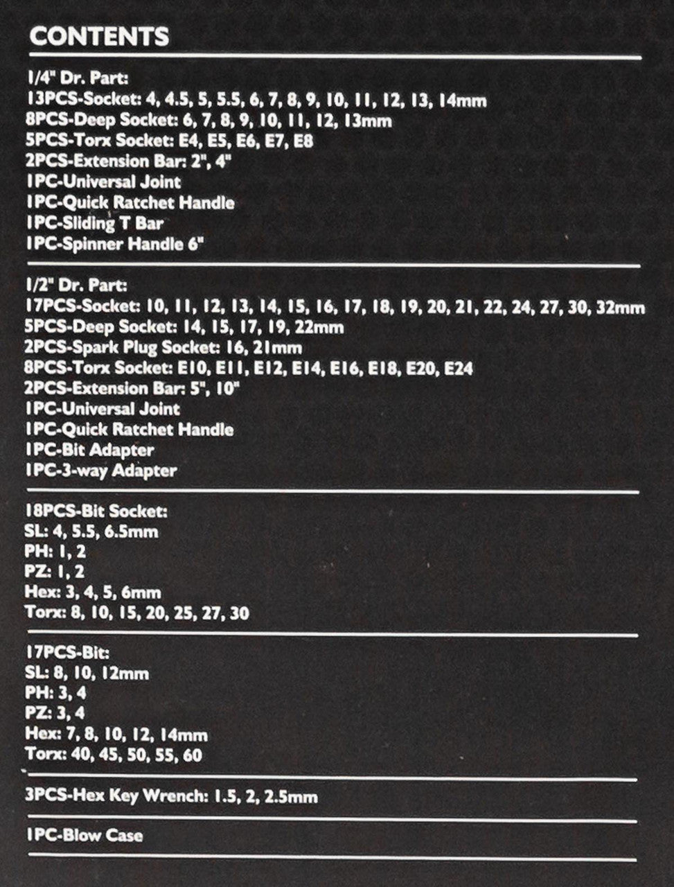 • 13 PCS SOCKET: 4, 4.5, 5, 5.5, 6,7, 8, 9, 10, 11, 12, 13, 14 MM